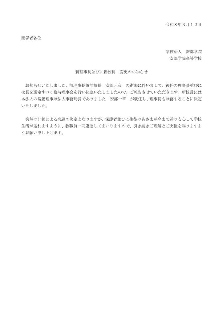 先の記事にてお知らせいたしました、前理事長兼前校長の逝去に伴う今後の新体制について、文書を掲載いたしました。